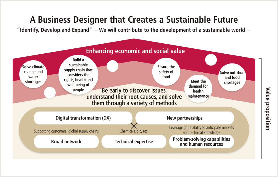 By combining the strengths of the NAGASE Group, such as its broad network, technological expertise, problem-solving capabilities and human resources, with DX, sustainability and partnerships within and outside the Group, we will quickly identify the problems of our customers and society and create value that leads to solutions. We will enhance economic and social value by designing business through “Identify, Develop and Expand,” and aim to contribute to the development of a sustainable world.