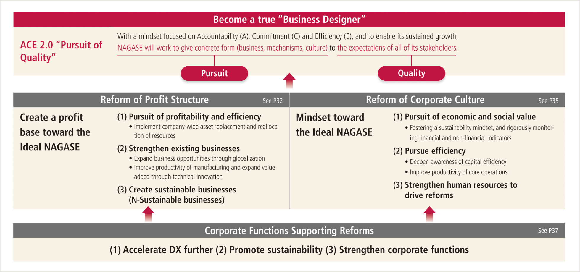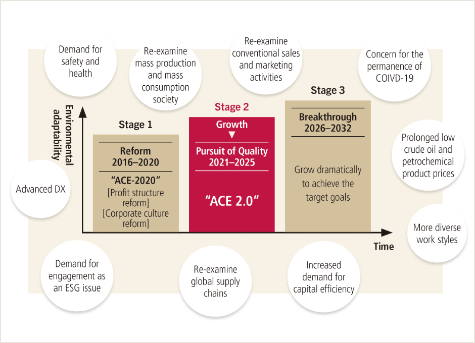 With the rapid changes in the external environment, expectations for the creation of social value by corporations are rising. In response to this, we have positioned the second stage toward the realization of NAGASE as a period of “Pursuit of Quality” rather than a period of growth as originally envisioned. Continuing the mindset of Accountability (A), Commitment (C) and Efficiency (E), ACE 2.0 was named with the meaning of following on with the basic concept yet being an improved version of ACE-2020. To enable the sustainable growth of the NAGASE Group, we aim to create (= pursue) concrete forms (= business, mechanisms, culture) that meet the expectations (= quality) of all our stakeholders.