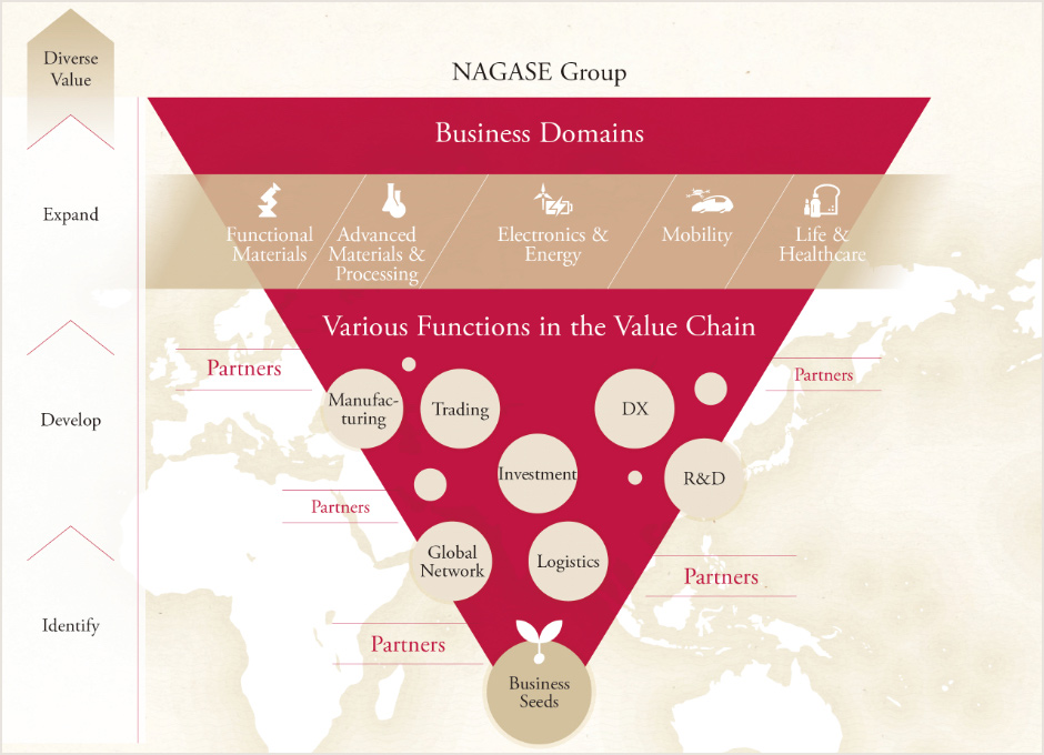 The NAGASE Group has grown into a corporate entity with diverse functions, including trading, manufacturing, processing, and R&D. While leveraging and adding on to those functions, it strives to create an array of value. It has also been focusing on sustainability management in recent years. NAGASE aims to help solve social and environmental issues for the sustainable growth of society and the Group.