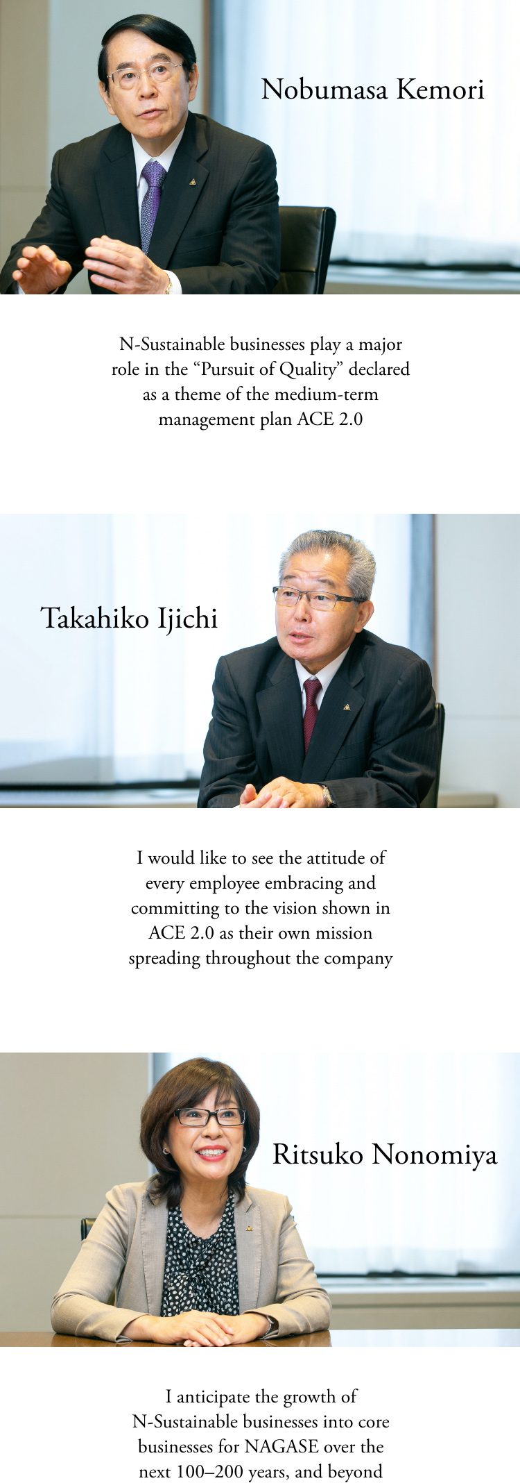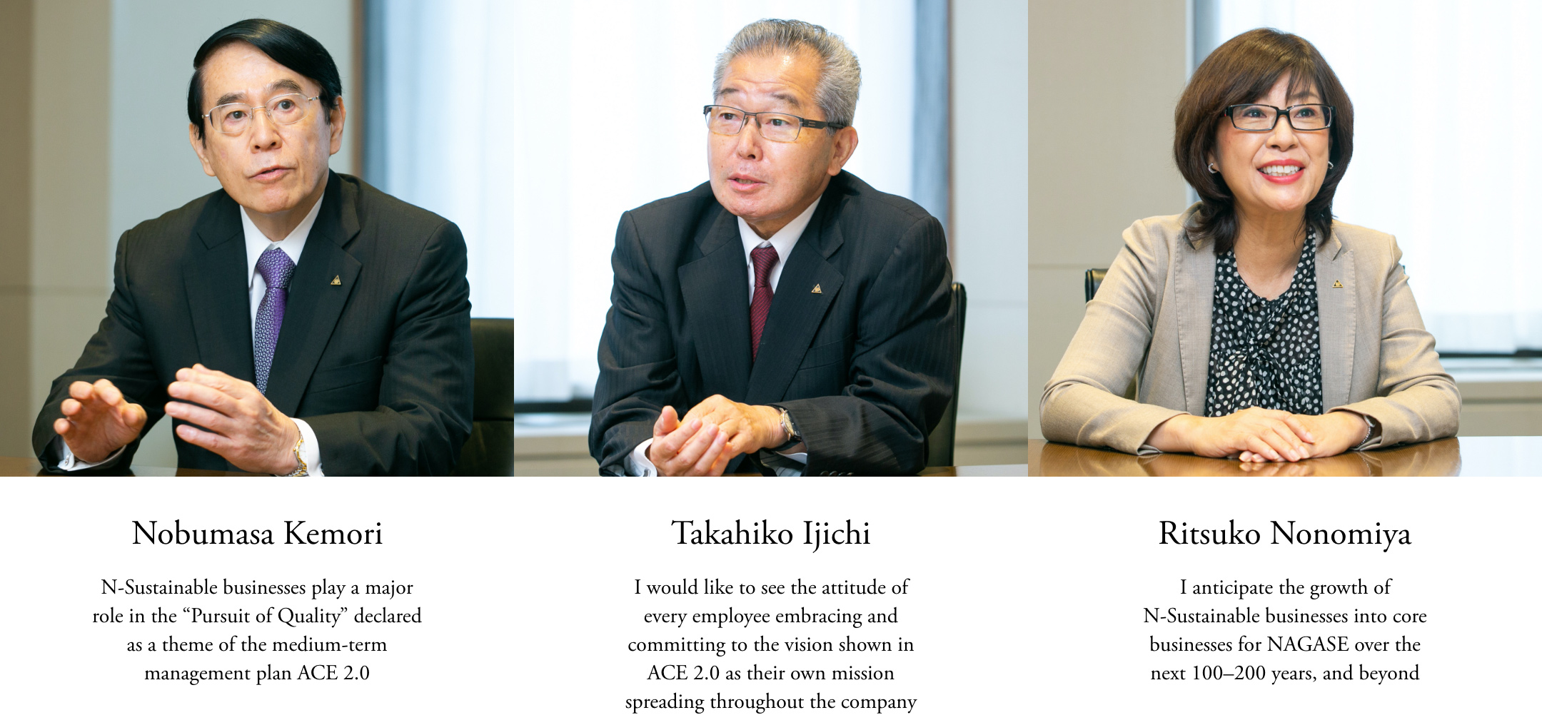 A year has passed since Mr. Takahiko Ijichi and Ms. Ritsuko Nonomiya joined Mr. Nobumasa Kemori as outside directors in 2020, bringing the number of outside directors at NAGASE to three. They gathered to talk about their expectations of ACE 2.0 and sustainability for the NAGASE Group.
