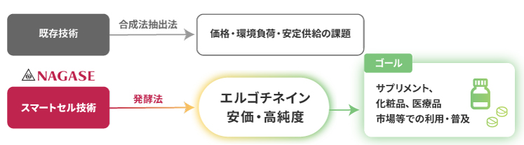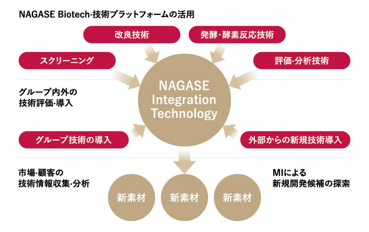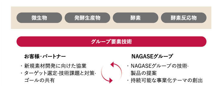 NAGASEグループでは、独自の発酵技術をコア技術とする「ナガセバイオイノベーションセンター」の研究を通じ、革新的な発酵生産プロセスを確立し、微生物を用いて世界最高レベルの生産性を達成しました(※)。今後は、開発した生産菌株を活用し、健康食品、化粧品、医薬品などのライフサイエンス分野への用途展開を通じた事業化を目指します。