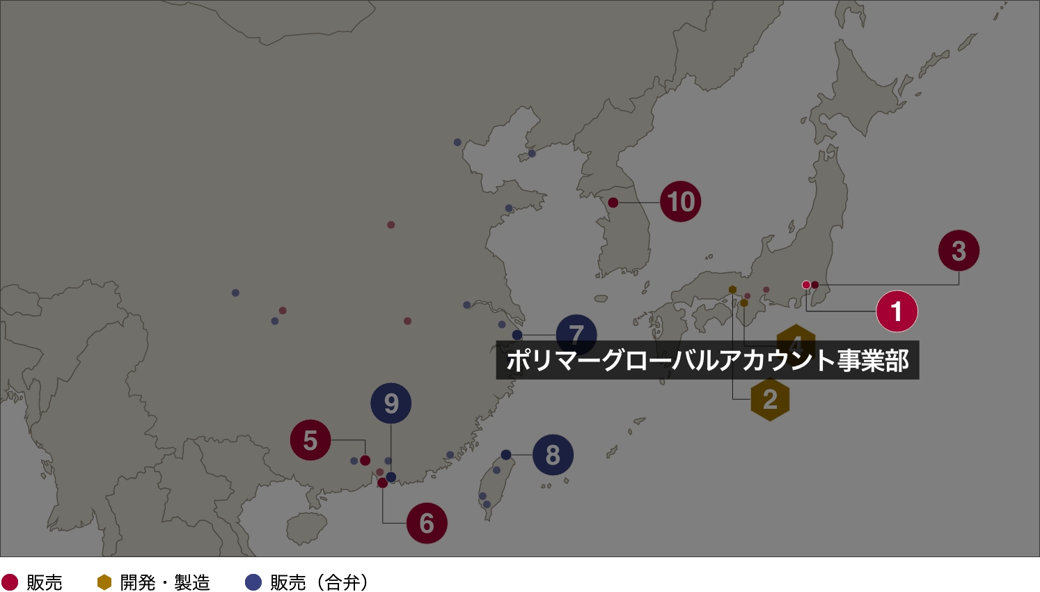 当事業部は、アジアパシフィックにおける充実した販売網・経験豊富なナショナルスタッフ体制のもと、グローバル企業と連携し、OA機器や電気・電子業界を中心に幅広い産業に合成樹脂を販売。リサイクル素材やバイオマスプラスチックなどの環境に優しい素材やサービスの提供といった環境配慮型ビジネスにも注力しています。