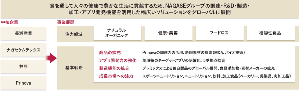 NAGASEグループが見据えるのはグローバルな食品素材市場です。食の安心・安全、健康で豊かな生活に対するニーズは、世界中で高まっています。NAGASEグループは今後、これらのニーズに応えていきます。事業展開の鍵を握るのが、2019年8月にNAGASEグループの一員となった、Prinovaグループです。同社はNAGASEグループ同様、商社機能と製造機能を併せ持つハイブリッド型の企業です。今後はグローバルネットワークを通じて多様な食品素材を扱いますが、まずは、Prinovaの競争力があるスポーツニュートリション、ニュートリション事業の拡大を図っていきます。またアプリ開発等により、ベーカリー、乳製品、肉加工品という加工食品分野でのビジネスの拡大を図っていきます。