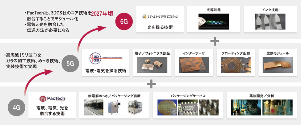 NAGASEグループではこれまで、情報通信関連ビジネスにおける材料開発に関し、M&Aや人財交流などを通じて体制の整備を進めてきました。とりわけ、レーザー接合技術・微細加工プロセス技術に強みを持つドイツのPacTech社、電波・電気・光を融合する技術に強みを持つフィンランドのINKRON社、3次元ガラス加工技術をコア技術とする米国の3D Glass Solutions社(3DGS社)との連携が、今後の事業拡大に向けて、重要な鍵を握ると考えています。