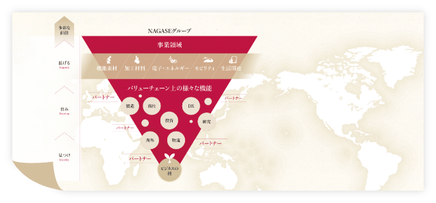 NAGASEグループの価値創造ストーリー全体像 | NAGASEグループの社会的な存在意義 | 価値創造の歴史 | NAGASEグループのビジネスモデル | 重要な経営資源 | NAGASEグループが直面するリスクと機会 | 特集 未来を見据えた新たなビジネス | NAGASEグループが取り組むサステナビリティ経営