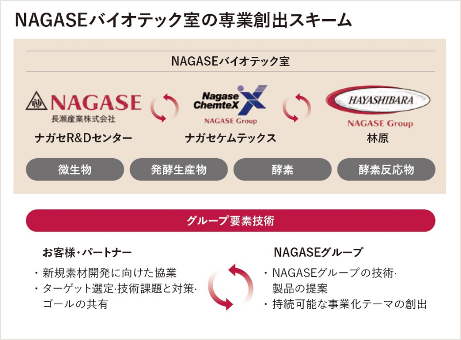 NAGASEグループには、微生物、発酵生産物、酵素・酵素反応物の研究開発と生産に関する多様な要素技術があります。これまでは、ナガセR&Dセンター(長瀬産業)、ナガセケムテックス(株)、(株)林原のそれぞれが個別に技術の開発に取り組んできました。しかしながら、この状況ではそれぞれが持つ技術にどうしても縛られ、飛躍的な発展につながりにくいという課題がありました。