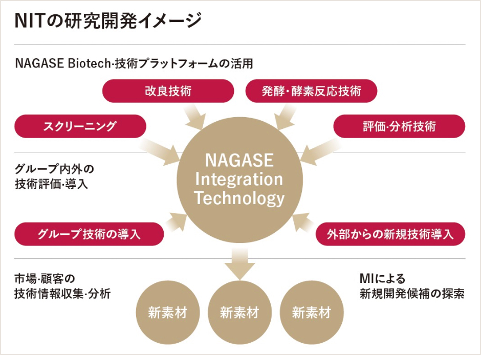 技術の面では「NAGASE Integration Technology(NIT)」という戦略を打ち出します。3社が有するバイオ技術の強みを「スクリーニング」「改良技術」「発酵・酵素反応技術」「評価・分析技術」の4つの枠組みで分析し、それをもとに技術の選定や統合を行うことで、NAGASEならではの新たなバイオ技術を開発します。また、バイオとデジタルのシナジーが高いことから、NAGASEが2020年11月よりサービス提供を開始した、AIを活用した新素材探索プラットフォーム「TABRASA™」との連携を通じて、新素材の価値や可能性を市場に提供していきます。