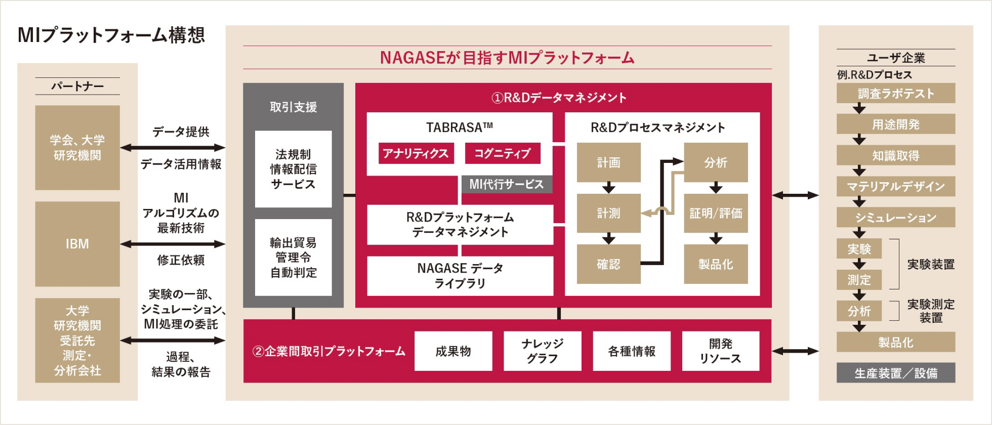 NAGASEグループでは、AIの活用で新規材料の開発を変革するマテリアルズ・インフォマティクス(MI)のプラットフォーム「TABRASA™」をIBM社と共同開発し、2020年11月、SaaSサービスとして外部への提供を開始しました。