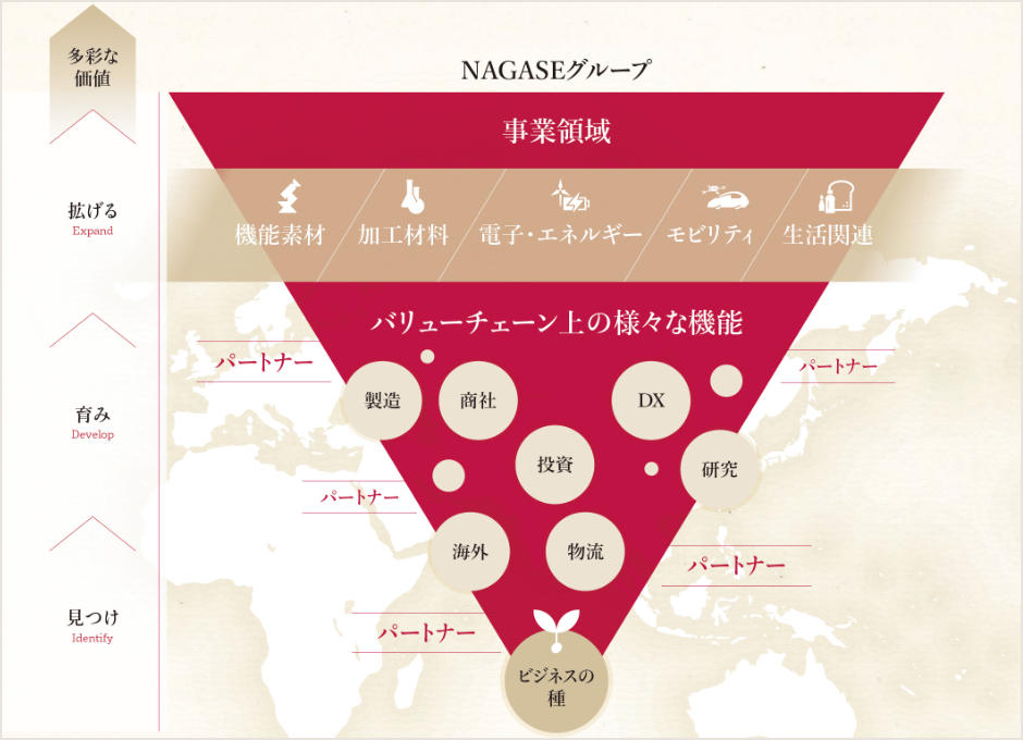 1990年代以降は、研究開発機能の拡充を本格化。1990年にバイオ関連の研究開発拠点となるナガセR&Dセンターを設立。2000年代に入っても、ナガセケムテックス(株)のエポキシ樹脂の工場として中国・長瀬電子材料(無錫)有限公司を設立。また、ドイツ・PacTech社を子会社化しました。2007年には、オープンイノベーションラボであるナガセアプリケーションワークショップを開設し、研究開発機能においても優位性確保を推進しました。