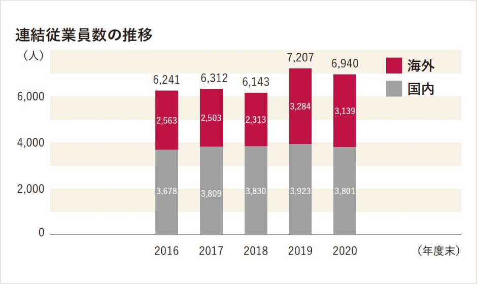 NAGASEグループには豊富な人的資本が存在します。グループ全体の従業員数は6,940名であり、そのうちの3,139名が海外に在住しています。「変革を推進する人財の強化」と「コンプライアンス強化」の両側面から強い組織づくりを目指しています