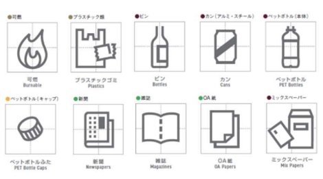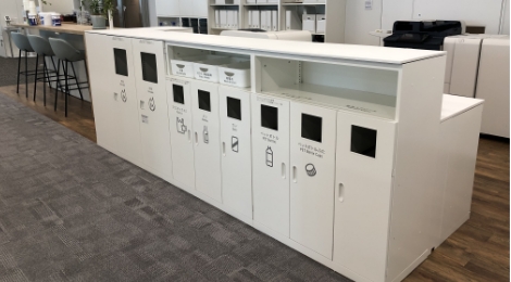 事業系施設では、ゴミを排出する時点で適正に分別することはとても重要です。長瀬産業東京本社オフィスでは、執務席には個別ごみ箱は設けず、フロア内に集約配置されたユーティリティにのみ分別リサイクルBOXを設置し、3R活動を推進しています。