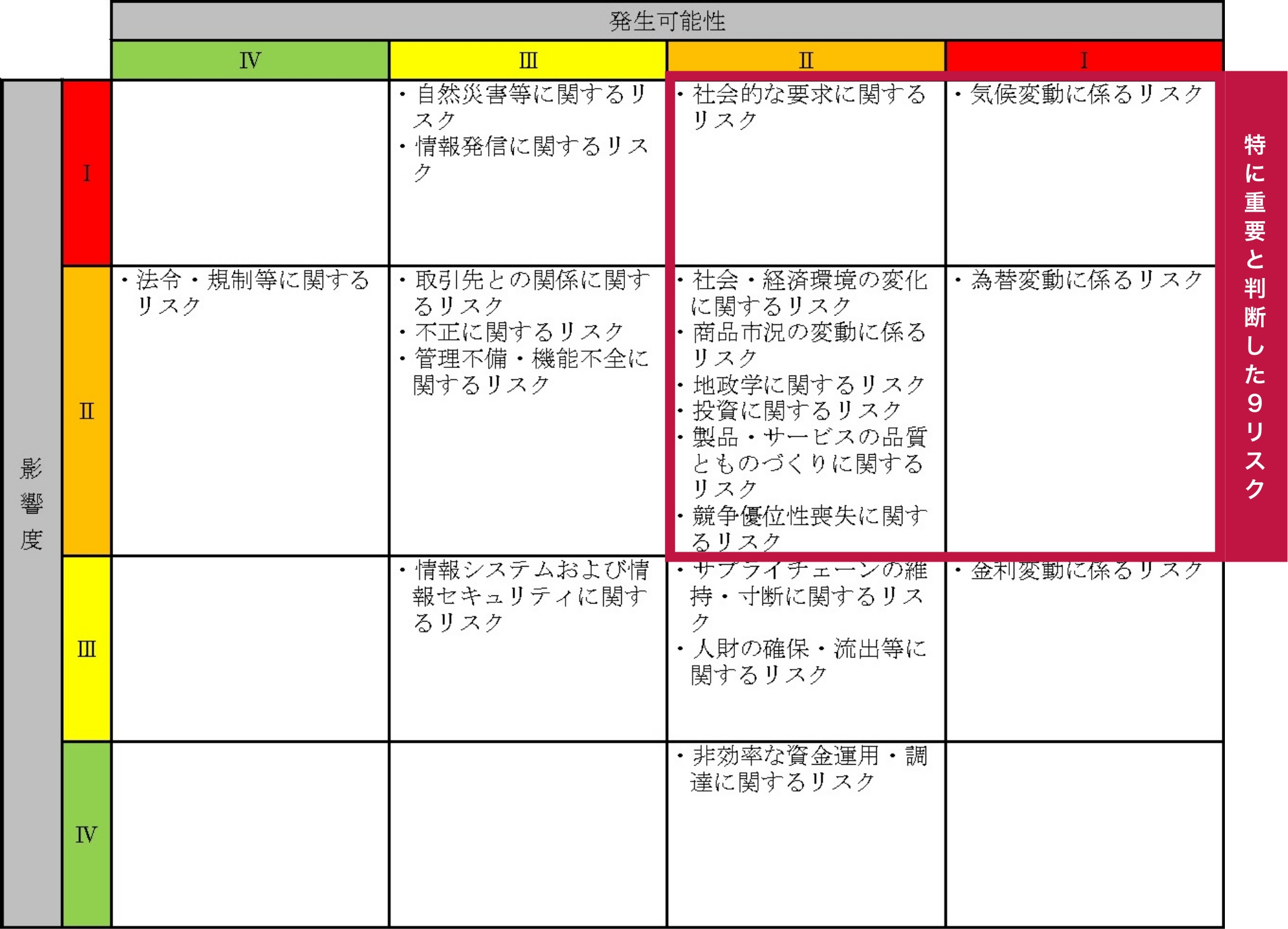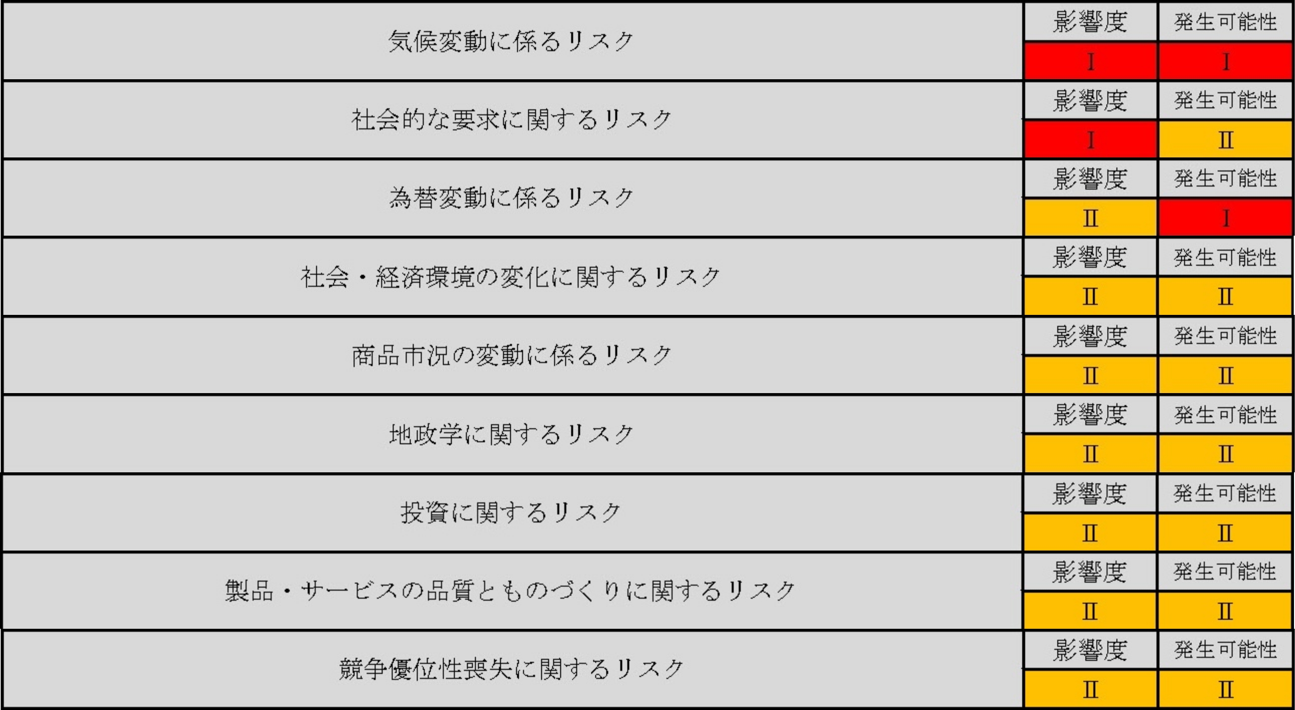 | 社会的な要求に関するリスク | ESG対応、サプライチェーン上の社会的要請、人権対応失敗 |