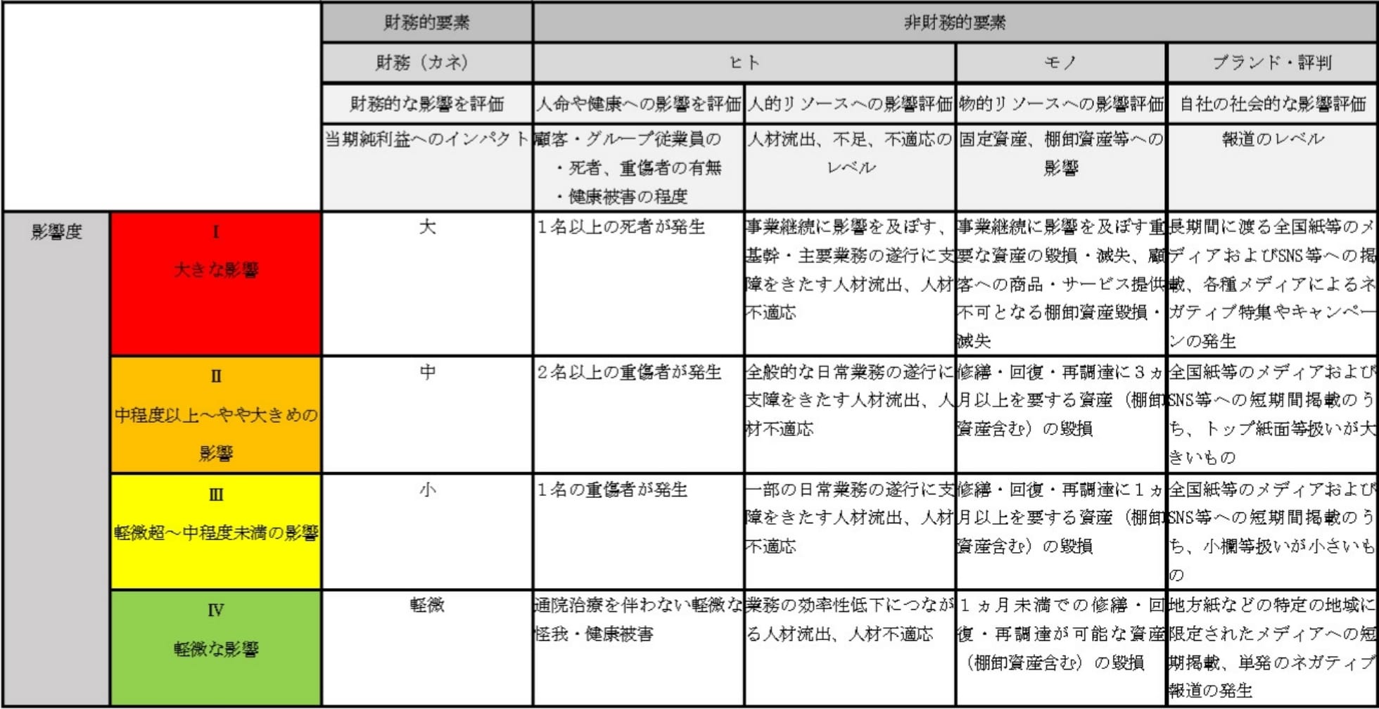 財務的要素、⾮財務的要素(ヒト、モノ、ブランド・評判)について影響度に応じ4段階の評価基準を設定しています。