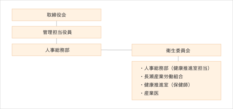 NAGASEグループの労働安全衛生マネジメントは、担当取締役を最高責任者に任命し、労働安全衛生の管理の主体である各組織を人事総務部が取りまとめ、担当取締役が最高責任者として取締役会へ報告しています。